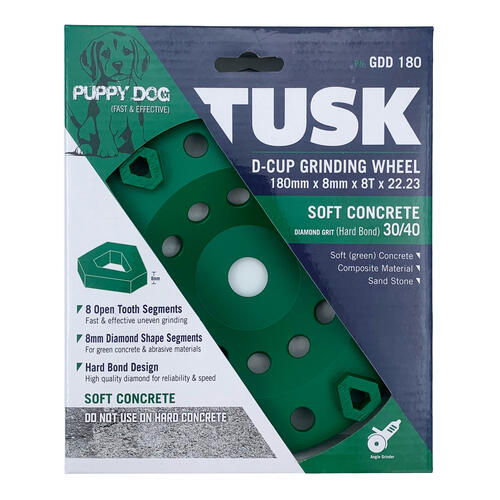 The Tusk Grinding Cup Wheel - Puppy Dog (GDD) is designed for fast and effective grinding on soft concrete, composite materials, and sandstone. With its hard bond construction, this grinding cup wheel provides durability and longevity, making it the perfect choice for professionals.