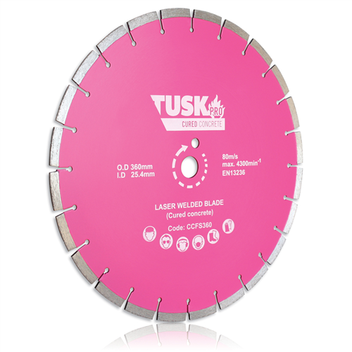 "The Tusk Cured Concrete Floor Saw Blade 360mm CCFS360 is specifically designed for cutting cured concrete with precision and durability. With high-quality, diamond-tipped segments, this 360mm blade provides fast, efficient cuts through hard, cured concrete surfaces, making it ideal for flooring professionals, contractors, and builders handling demanding residential and commercial projects."