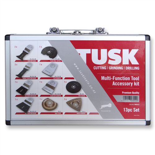 Tusk Multi-Function Tool Accessory Kit - 13pc Set is the ultimate accessory collection for your multi-tools, providing you with a variety of high-quality blades and attachments to tackle a wide range of cutting, sanding, and scraping tasks. This versatile kit is designed to meet the demands of New Zealand professionals in construction, flooring, and renovation, offering everything you need for precise and efficient work in a single, convenient set."